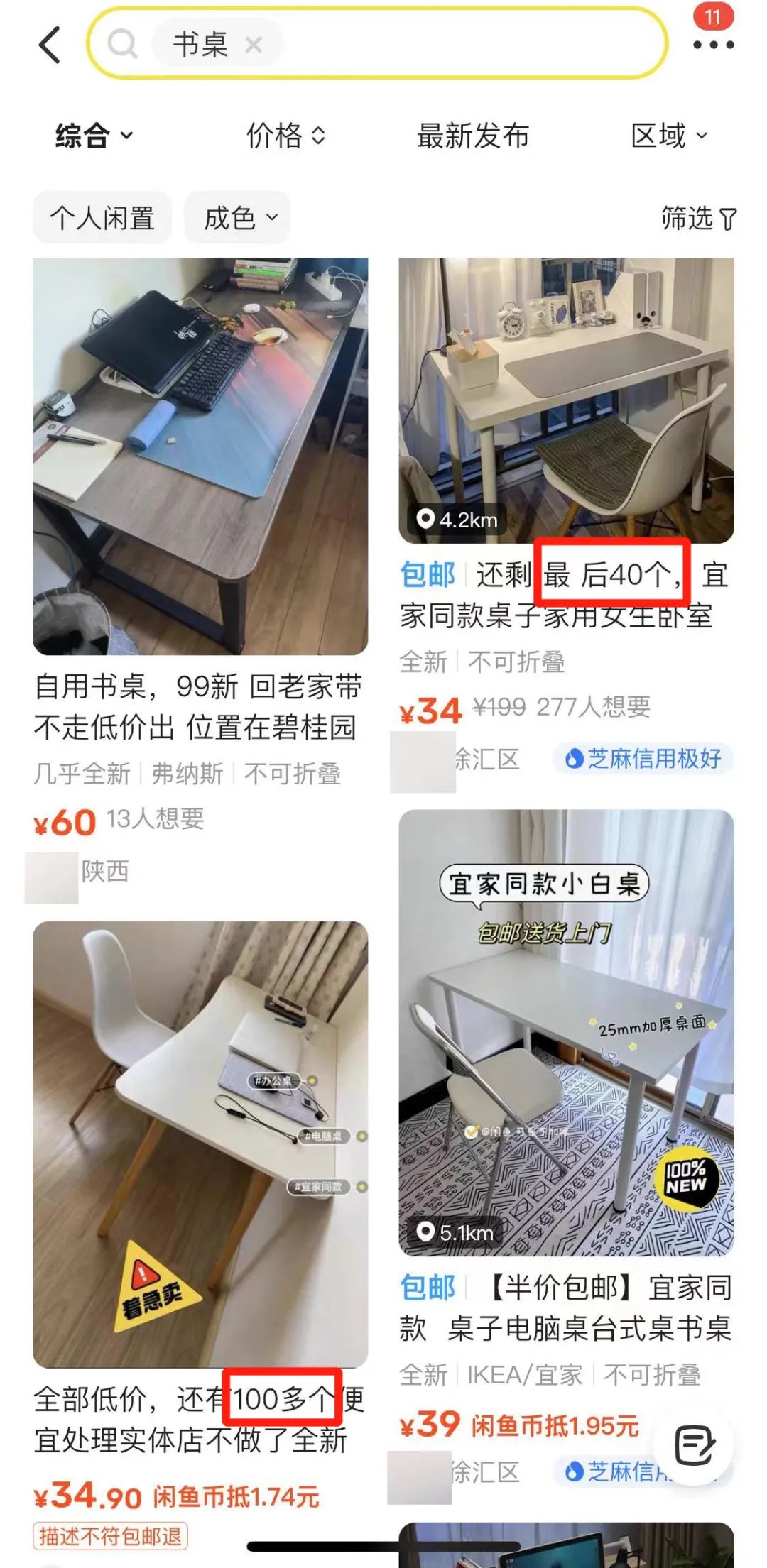 《IT时报》记者在闲鱼以“书桌”为关键词搜索,首页卖家多为带有“鱼小铺”认证的职业卖家,真正的个人卖家鲜有看到,不少商品链接能直接转入淘宝。