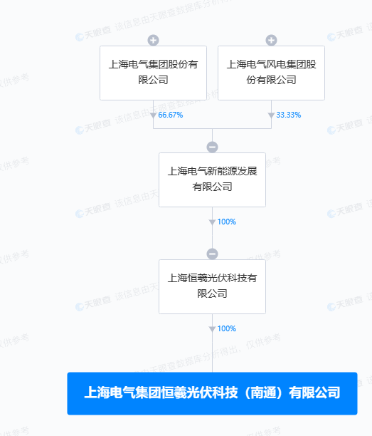 6月12日下午,天眼查显示,近日,上海电气集团恒羲光伏科技(南通)有限公司成立,法定代表人为沈兵,注册资本4.25亿元,经营范围包含:光伏设备及元器件制造;新材料技术研发;太阳能发电技术服务;新能源原动设备制造等。股权穿透显示,该公司由上海电气、电气风电合资企业上海电气新能源发展有限公司间接全资持股。