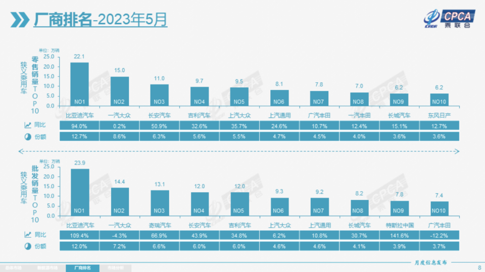 6月9日,乘联会发布5月厂商零售销量排名。其中,4家自主品牌跻身前十,比亚迪、长安汽车、吉利汽车、长城汽车分别以22.1万辆、11.0万辆、9.7万辆、6.2万辆的销量排名第一、第三、第四、第十位,并合计贡献了前十大品牌47.7%的销量。而在去年同期,一汽-大众零售销量排名榜首,前十大品牌中自主品牌销量仅占36.5%。
