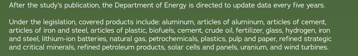 该法案要求,在其生效后两年内,美国能源部将进行一项全面的研究,并公布美国和其它国家生产的特定产品的碳排放强度,并将这些指标进行对比,以论证美国产品具备低碳优势。