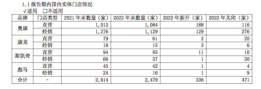 2022年末,奥康鞋业的门店数量是2479家,较2021年末的2614家减少了135家。
