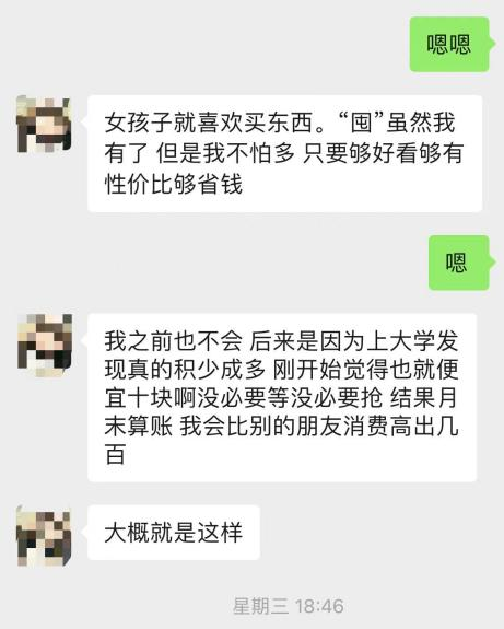 我表妹也对我说,玩拼多多会有种“占便宜”的快感。晚上无聊时她会参与“晚8点 加倍补”的活动,并找到各种自己喜欢或需要的低价商品,这对于她来说晚上闲暇的时光的一种娱乐方式。