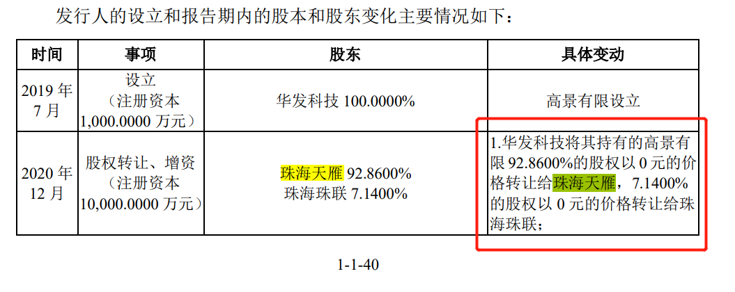 而成为这个实控人,徐志群似乎没有投入真金白银。招股书显示,2020年12月7日,华发科技以0元的价格向珠海天雁转让高景有限92.86%股权,以0元的价格向珠海珠联转让高景有限7.14%股权。招股书提及,彼时高景太阳能实缴资本为0。