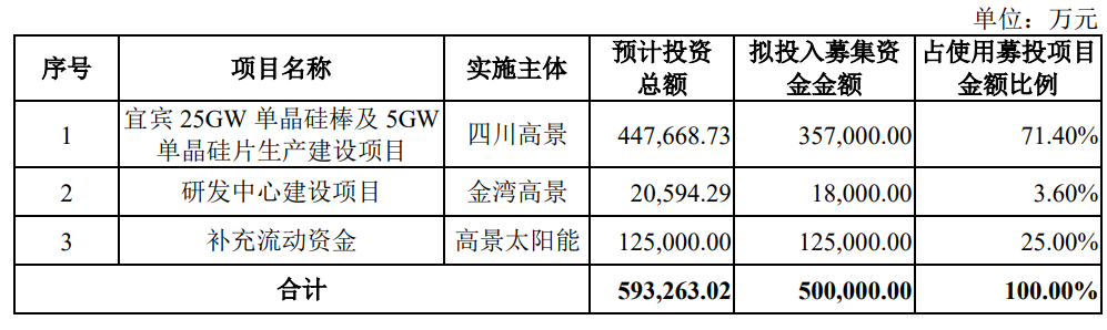 此外,高景太阳能本次IPO拟募集资金50亿元,其中71.4%的资金用于宜宾25GW单晶硅棒及5GW单晶硅片生产建设项目,进一步扩大产能,仅有3.6%的资金用于研发中心建设项目。