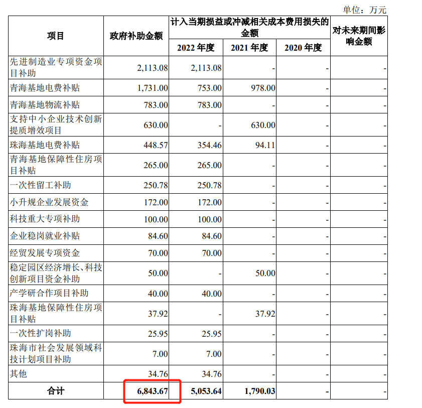 在电费补贴、物流补贴、保障房项目补贴等与收益相关的政府补助中,共获得了6843.67万元政府补助。