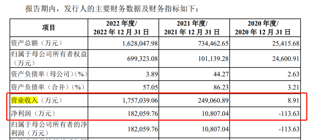 从营业表现来看,2020年-2022年,其营业收入分别为8.91万元、24.91亿元、175.70亿元;净利润分别为-113.63万元、1.08亿元、18.21亿元,发展速度着实令人惊讶。