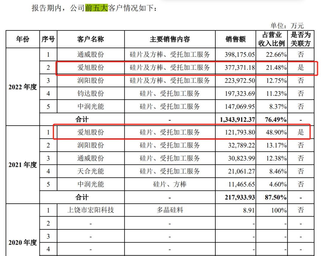 招股书显示,2021年、2022年,公司向爱旭股份出售商品和提供服务的金额分别为12.18亿元、37.74亿元,贡献了总营业收入的48.90%、21.48%。