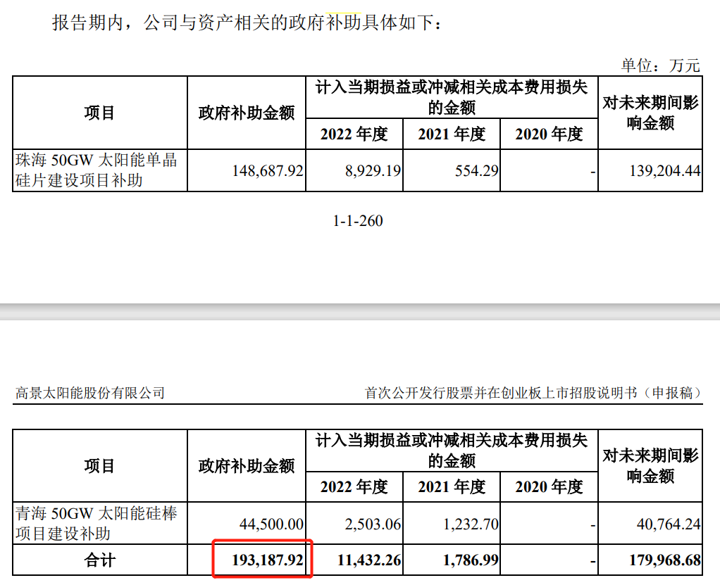 招股书显示,在与资产相关的政府补助中,珠海50GW太阳能单晶硅片建设项目获得政府补助14.87亿元、青海50GW太阳能硅棒项目建设项目获得政府补助4.45亿元。