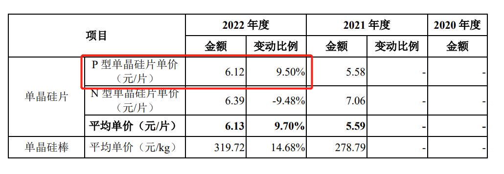 而在与巨头的对峙中,高景太阳能并没有价格优势。以2022年贡献了超80%营收的P型硅片为例,招股书显示,2022年P型单晶硅片单价同比增长9.5%至6.12元/片。