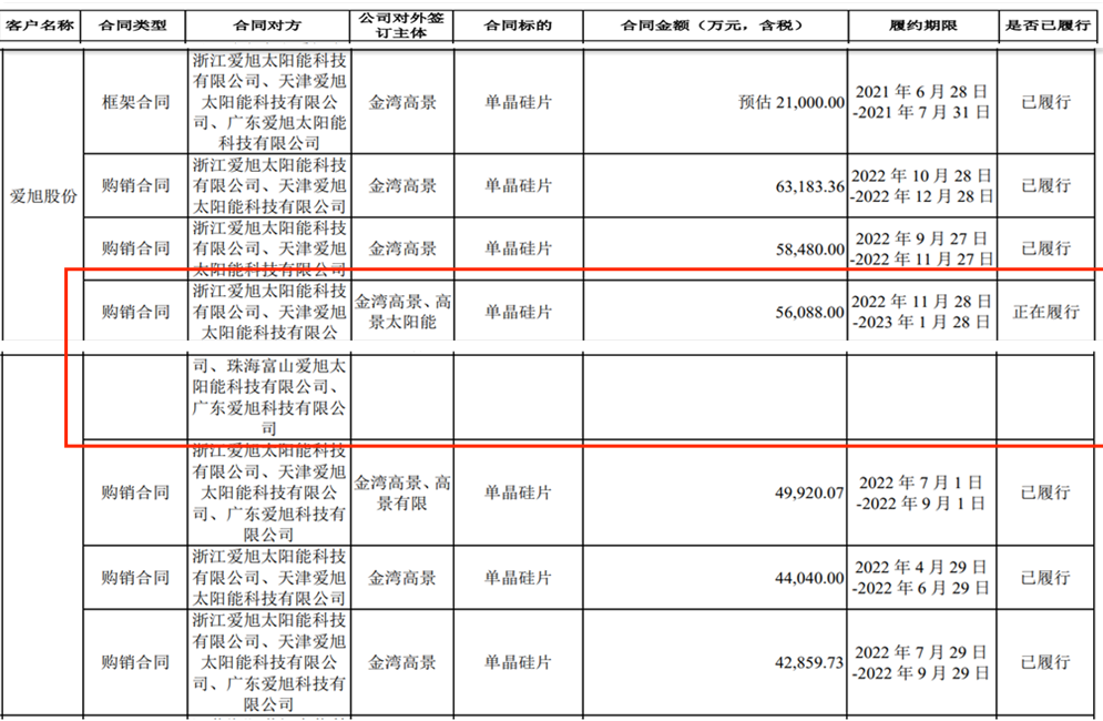 据「子弹财经」不完全统计,截至招股书发布之日,高景太阳能与爱旭股份共签订了7个合同。其中,6个已履行完毕,正在履行的是一个价值5.61亿元(含税)的单晶硅片合约。