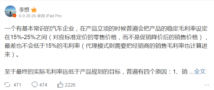 在蔚来汽车发布1季度财报后,理想汽车CEO李想发微博表示,“一个有基本常识的汽车企业,在产品立项的时候普遍会把产品的稳定毛利率设定在15%-25%之间(对应标准定价的零售价格,而不是促销降价后的销售价格),最差也不会低于15%的毛利率(代理模式则需要把经销商的销售毛利率也计算进来)。”