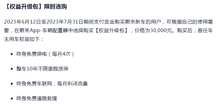 此外,李斌的“厚道”还体现在待提车和已提车用户(指“在2023年5月24日至2023年6月11日期间提车的用户”)的权益保护,两类用户可以选择取消上述3万元“权益升级包”的服务,从而减免3万元购车款或得到3万元的退款。