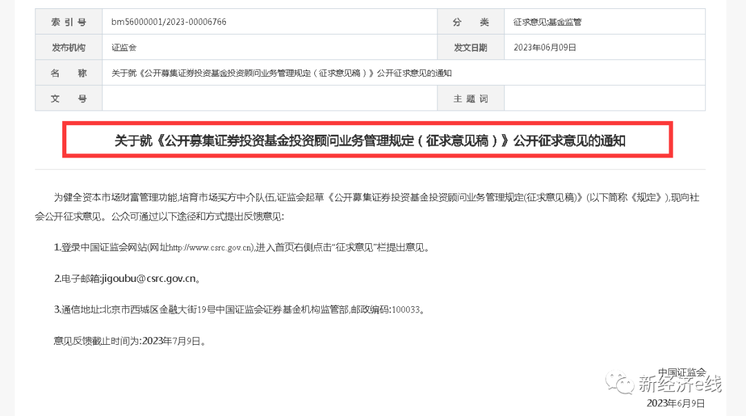 6月9日,证监会就《公开募集证券投资基金投资顾问业务管理规定(征求意见稿)》(以下简称《规定》)公开征求意见。意见反馈截止时间为:2023年7月9日。