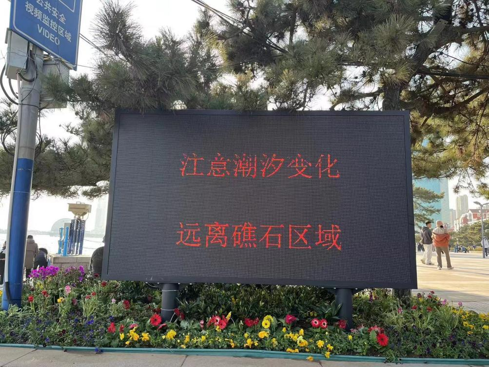 走进栈桥,市民游客就可以在显眼处发现1处LED大屏,大屏上每天滚动播出潮汐信息,给景区海上浴场撑起了一把保护伞,为游客安全保驾护航。