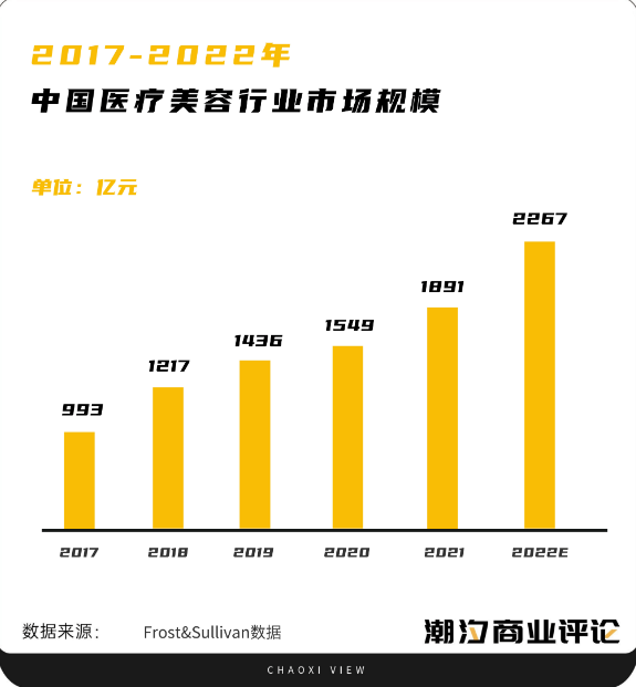 据Frost&Sullivan数据显示,中国医美市场规模已由2017年的993亿元增至2021年的1891亿元,年复合增长率为17.5%,远高于全球市场,预计2022年中国医美市场规模将达2267亿元。与此同时,预计到2027年,我国非手术类轻医美市场规模有望达到2,745亿元,较2021年增长1.8倍。