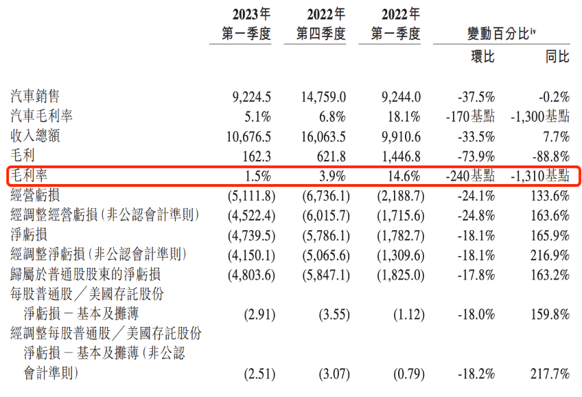 6月9日,蔚来汽车发布了2023年一季度财报,财报显示,蔚来汽车一季度营收106.8亿元,亏损为48.04亿元。更为尴尬的是,其毛利率仅剩下了1.52%,而去年同期则为14.6%。实际上,毛利率偏低不仅仅是蔚来一家的问题,相比于特斯拉,比亚迪的毛利率也稍微偏低,一季度为17.86%,略高于15%的“基准线”,当然这是建立在庞大销量的基础上。