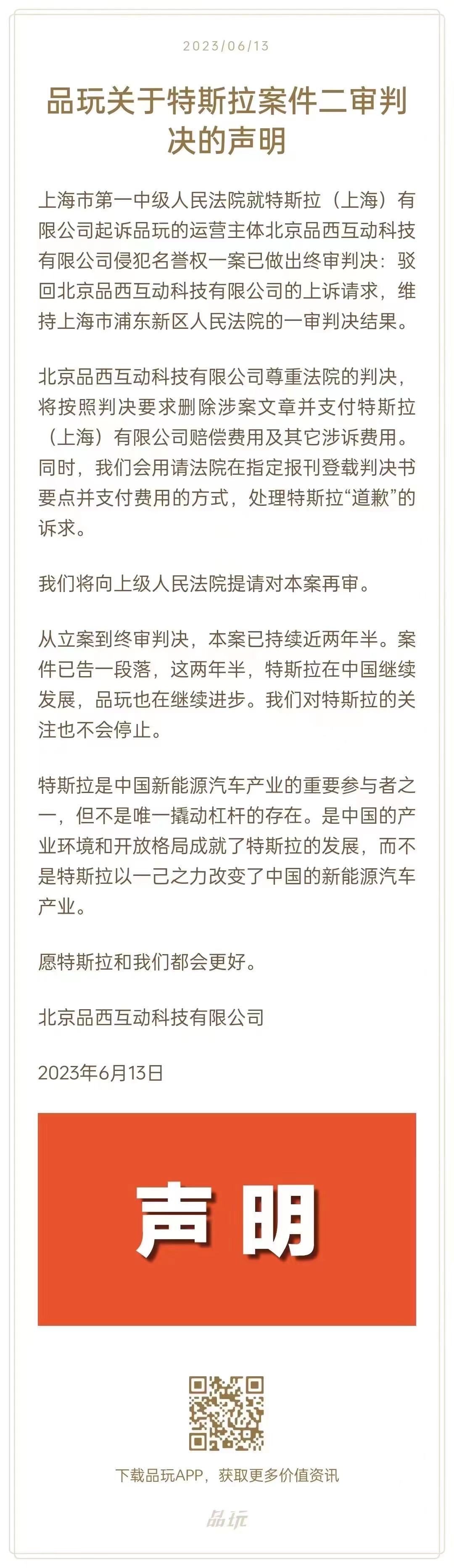 科技媒体品玩6月13日发布关于特斯拉案件二审判决的声明。品玩称,上海市第一中级人民法院就特斯拉(上海)有限公司起诉品玩的运营主体北京品西互动科技有限公司侵犯名誉权一案已做出终审判决:驳回北京品西互动科技有限公司的上诉请求,维持上海市浦东新区人民法院的一审判决结果。