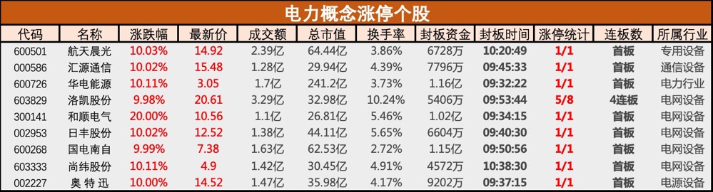 其中,洛凯股份走出8天5板行情,公司专注于高低压配电电器关键部附件的研发、生产、销售及服务,主要产品包括低压及中高压断路器配套用框架、智能环网柜及智能环网柜的断路器单元操作机构开关等。
