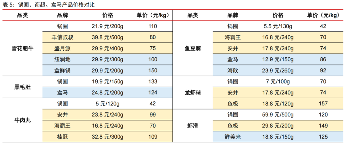 总体来看,锅圈所处的火锅食材赛道并非是高门槛行业,商业模式极易被复制,也很同意被其他渠道替代,缺乏强大的护城河。以商品价格为例,与盒马相比,锅圈的大多数商品价格并不亲民。如雪花肥牛,从单价来算,锅圈价格要比盒马贵10块钱。