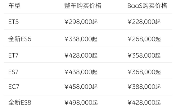 我们以蔚来产品中售价最低的ET5为例,搭载75kWh电池包车型起售价降至29.80万元,选用BaaS电池租用方案的话,起售价则会进一步下探至22.8万元,让蔚来全系产品能有更好的竞争力。
