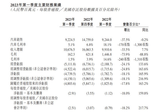 上周五蔚来刚公布了其第一季度的财报,财报数据显示,蔚来一季度营收106.77亿元,同比增长7.7%,环比下滑 33.5%;净亏损 47.40亿元,同比增长165.9%。而且整体毛利率降至1.5%,汽车业务毛利率降至了5.1%,环比下滑分别为2.4和1.7个百分点,同比去年同期的14.6%和18.1%更是大幅下降。