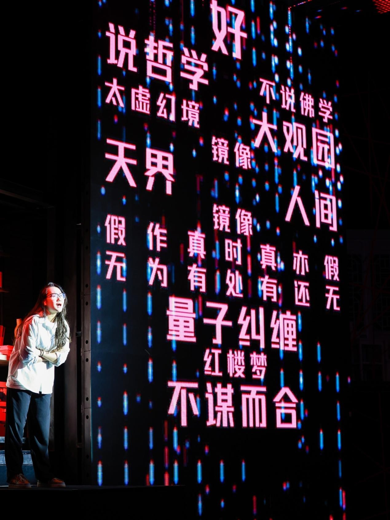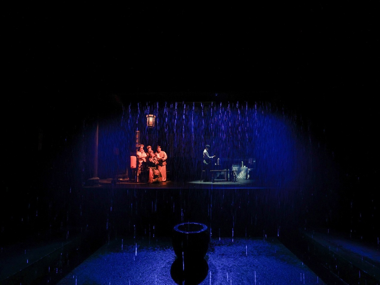 似乎又不完全是,巨大的环形剧场与升降舞台、室内水幕与雨雾场景、充满禅意哲思的黑白空间,以及那把纯红的太师椅,坐在上面的人是在看书吗?或许真如导演最初所言,这将是一座离读者最近的城,也是唯一一座以读者视角诠释《红楼梦》的城,甚至妄图将整个“红楼世界”都装入城中。