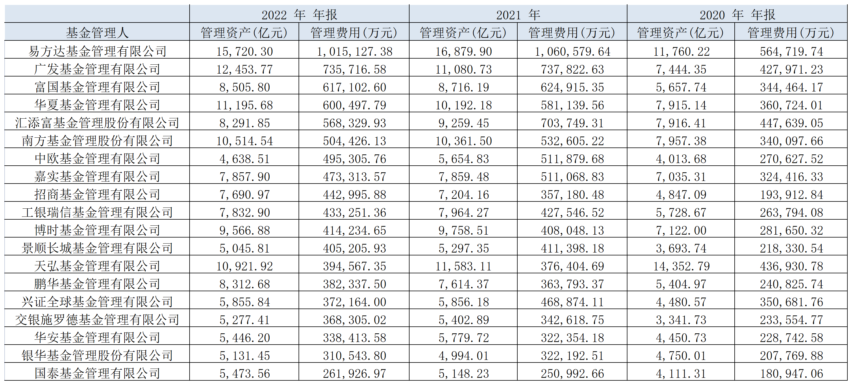 行业总规模迎来飞跃,头部公募的管理费收入也水涨船高。以行业老大易方达为例,从2020年至2022年,其管理资产从1.17万亿元增加至1.57万亿元,管理费收入则从56.47亿元增加至101.51亿元;广发基金的管理资产从7444.35亿元增加至1.24万亿元,管理费收入从42.79亿元增加至73.57亿元;富国基金的管理资产从5657.74亿元增加至8505.8亿元,管理费收入从34.45亿元增加至61.71亿元。