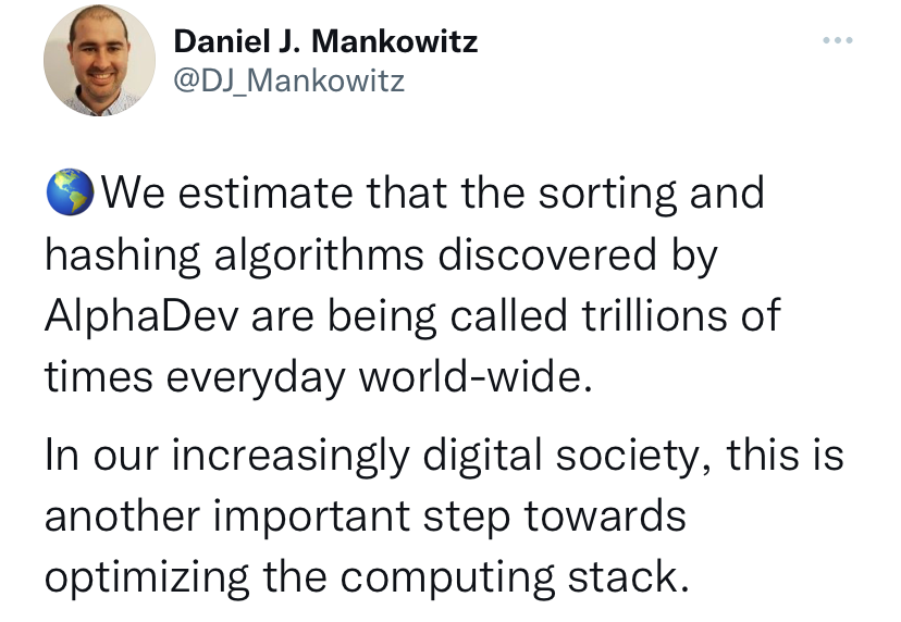 这项成果的重要性,正如Google DeepMind研究科学家Daniel J. Mankowitz所说:“我们估计,AlphaDev发现的排序和哈希算法,在全球范围内每天被调用数万亿次。”