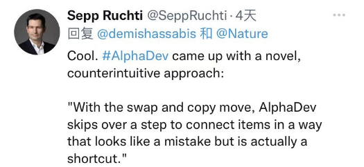 有网友对于AlphaDev的创新性大加赞同:“酷#AlphaDev提出了一种新颖的反垄断方法:通过交换和复制,AlphaDev跳过了一个步骤,以一种看似错误但实际上是捷径的方式连接项目。”