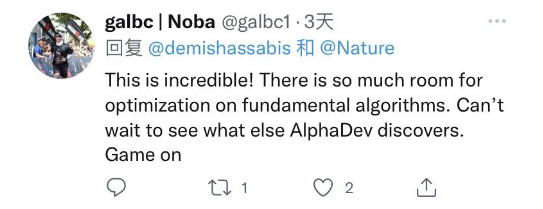 也有网友非常期待AlphaDev下一波会秀什么操作:“这太不可思议了!基本算法有很大的优化空间。等不及看看AlphaDev还发现了什么!游戏已经开始了。”