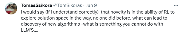 也有网友表示:“我会说(如果我理解正确的话),新颖性在于RL以前所未有的方式探索解决方案空间的能力,新算法如何被发现——这不是你能用LLM做的……”