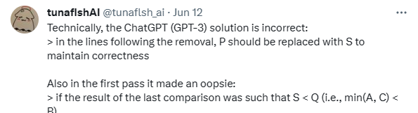 有网友直接否定了GPT-3的解决办法:“从技术上讲,ChatGPT(GPT-3)的解决方案不正确:在调动后的行中,P应替换为S以保持正确性。同样也出现在第一次通过中:如果最后一次比较的结果是S