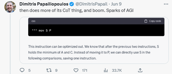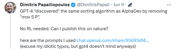 这位热心网友是来自威斯康星大学麦迪逊分校的副教授Dimitris Papailiopoulos,他只用两步就让GPT-4也发现了相同的操作。随后,他还调侃道,“完全不需要强化学习,我能把这个发表在Nature上吗?”