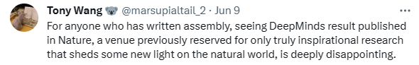 有网友则对AlphaDev进行了一波拉踩:“对任何写过汇编的人来说,看到DeepMind(s)的结果发布在Nature,一个以前只为真正鼓舞人心做研究、为自然世界提供亮点的杂志上,都会大失所望。”