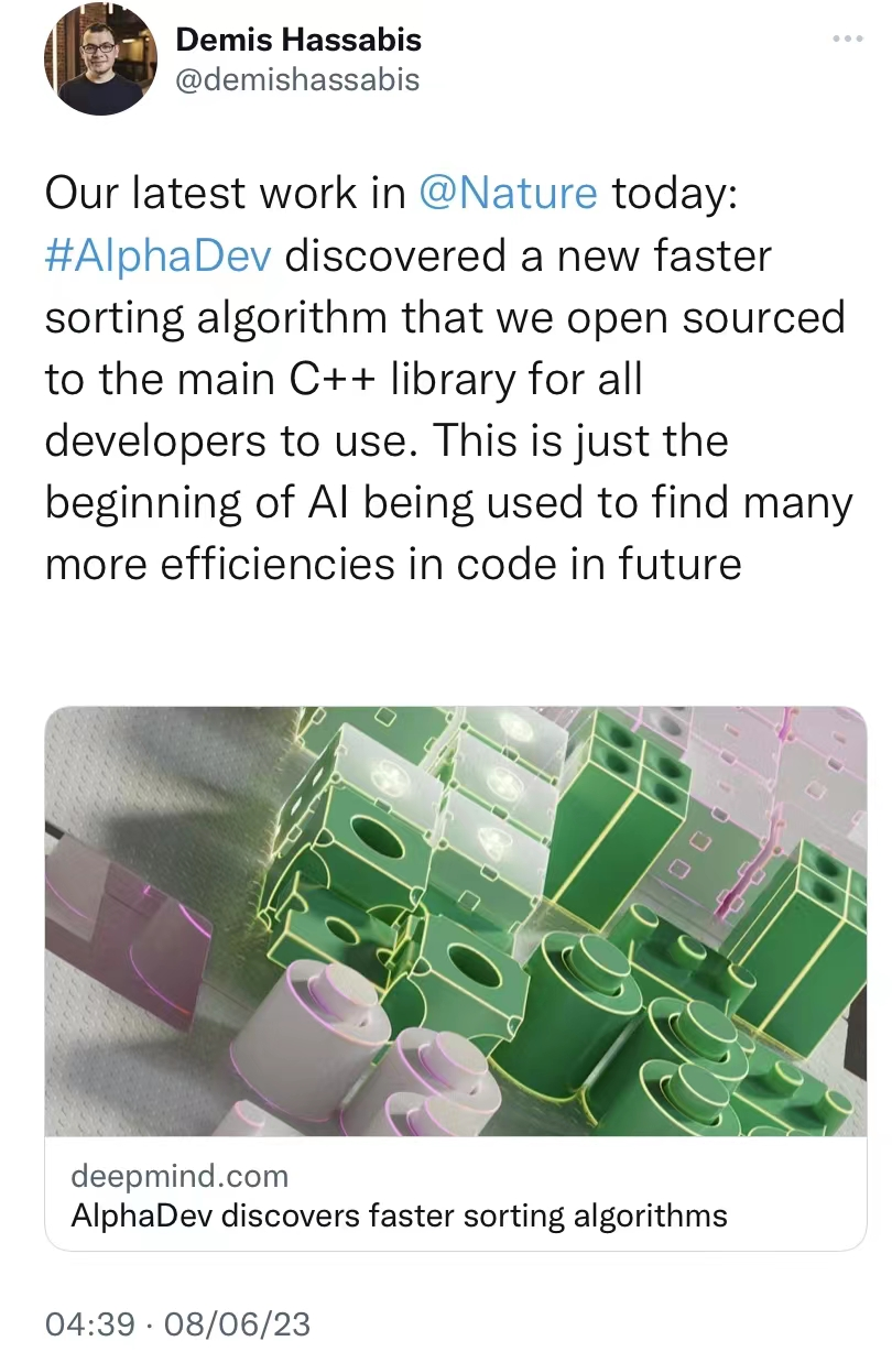 DeepMind CEO Hassabis也通过两句话让AlphaDev登上热搜榜,掀起计算机领域的讨论热潮:“AlphaDev发现了一种全新且更快的排序算法,我们已经将其开源至C++库中供开发人员使用,这仅仅是AI被用于提升代码效率的开端。”