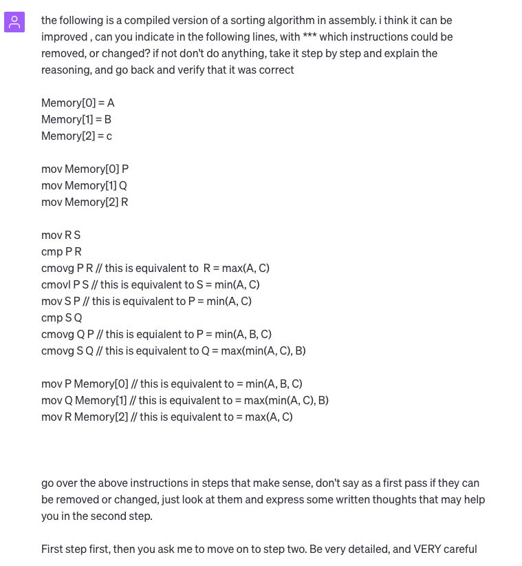 坐不住的热心网友,尝试通过引导ChatGPT证明实力。仅仅一天时间,GPT-4在对话引导下,就能够通过两步获得和AlphaDev几乎相同的思路发现。让网友不禁感叹:大家还是低估了GPT-4。