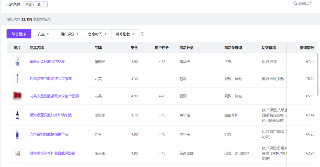 作为一种多功能的护肤活性成分,美容肽频繁出现在各种“热门功效成分榜单”。在美丽修行大数据平台上搜索“肽”相关的商品,当前备案有效的商品数量共有33198个,涉及到的品牌主要包括珀莱雅、丸美、薇诺娜等知名品牌。