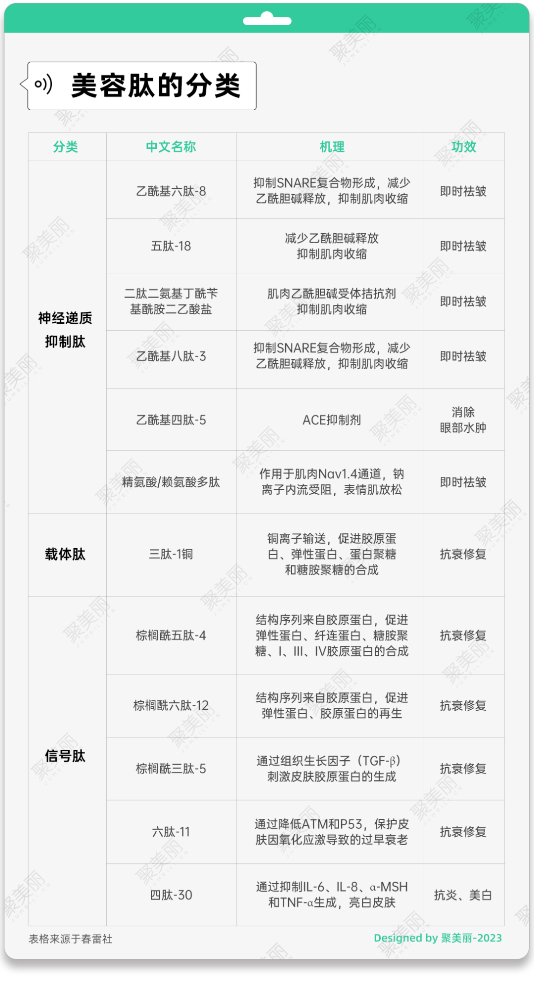 按照作用机理进行分类,美容肽主要分为三类:信号肽、载体肽和神经递质抑制肽,下图总结了化妆品中常用的美容肽及其种类、具体功效。