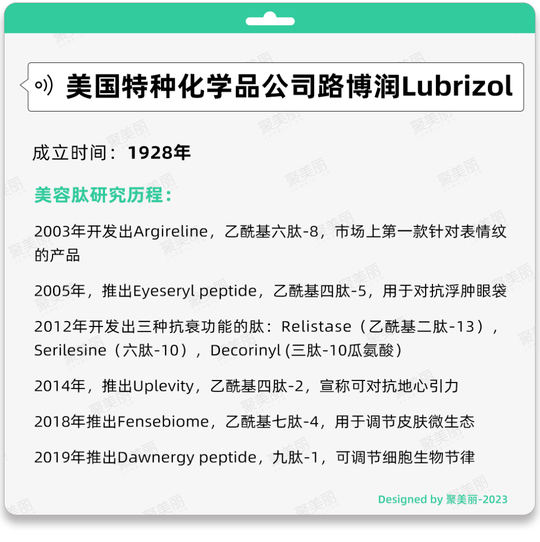 继Sederma之后更多原料公司的加入,进一步让人们看到美容肽的多样化。2001年,素有“胜肽世家”之称的路博润Lubrizol推出了市场上第一款针对表情纹的产品Argireline ,也就是乙酰基六肽-8,让“可涂抹的肉毒素”的概念深入人心。