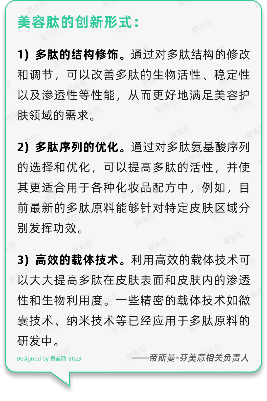 “这些新形式的创新都对多肽原料的生物学活性和稳定性等方面做出了改进,从而满足和增强美容护肤领域对于多肽的需求。虽然有些创新可以被视为较小的‘微创新’,但它们对于多肽在化妆品行业中的应用和开发上具有重要作用,同时也弥补了一些多肽在应用性上的不足。”