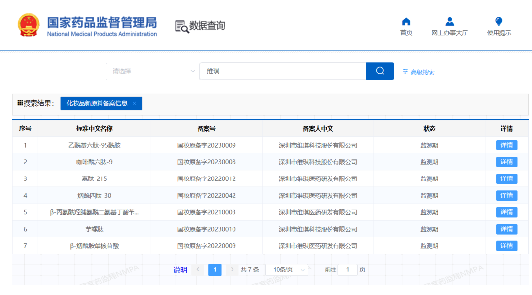 今年,维琪科技共计通过了7款新原料备案,其中有5款为美容肽,分别为乙酰基六肽-95酰胺、咖啡酰六肽-9、寡肽-215、烟酰四肽-30、芋螺肽。其中,除了芋螺肽之外,其余均为全新结构的美容肽分子。
