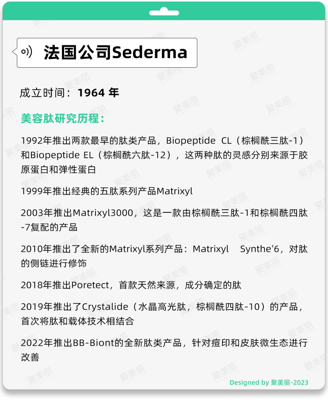 而在化妆品行业,美容肽起源于20世纪末,至今大约只有30年的历史。当时,Sederma美容肽产品Matrixyl系列的面世刷新了人们对于多肽的看法,也极大程度上影响着国内原料企业的美容肽研究历程。