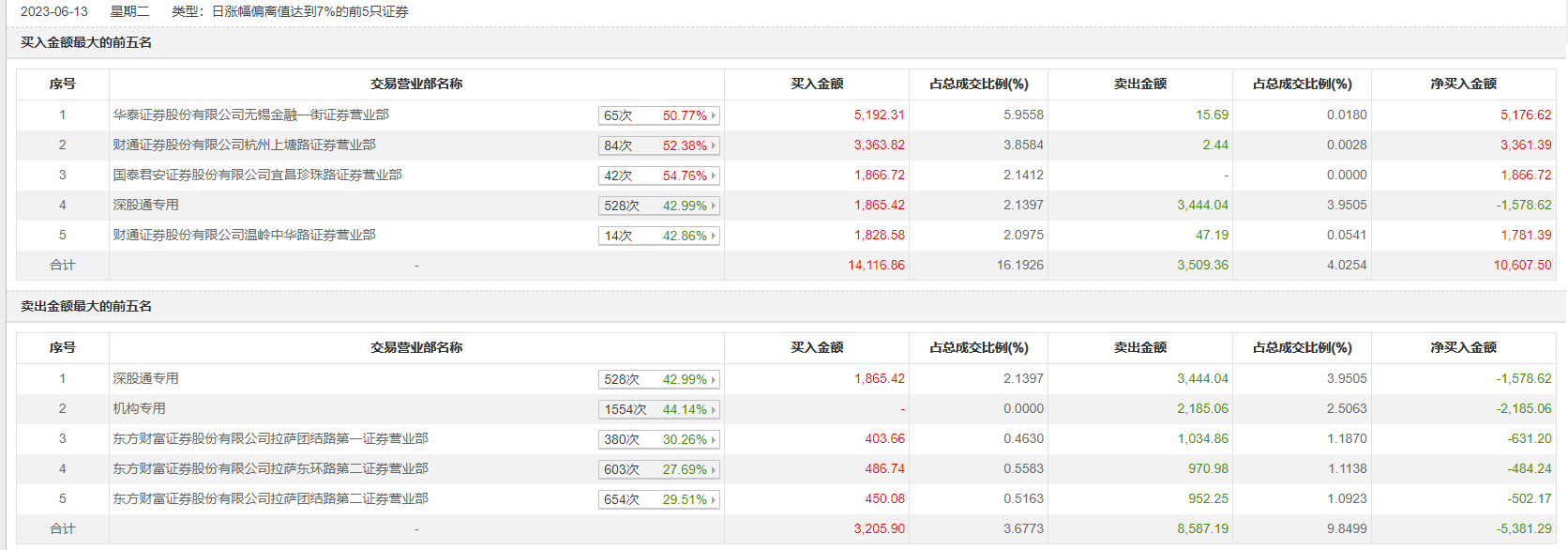 6月13日,意华股份今日涨停,龙虎榜数据显示,上榜营业部席位全天成交2.41亿元,占当日总成交金额比例为27.65%。其中,买入金额为1.55亿元,卖出金额为8652.51万元,合计净买入6804.83万元。
