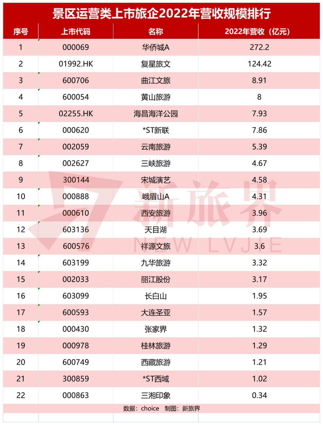 为了可资比较,新旅界筛选出22家景区运营类上市旅企,汇总了其2022年营收数据。从表格中可以看出,文旅产业的营收规模,华侨城A一家独大,2022年文旅综合收入高达272.2亿元,其次是复星旅文,其文旅业务收入也达到124.42亿元(注:华侨城A、*ST新联、三湘印象等三家企业,因房地产销售及其他收入占比较高,在年度总营收中剔除,表中仅保留文旅业务收入;复星旅文也剔除了物业销售收入)。