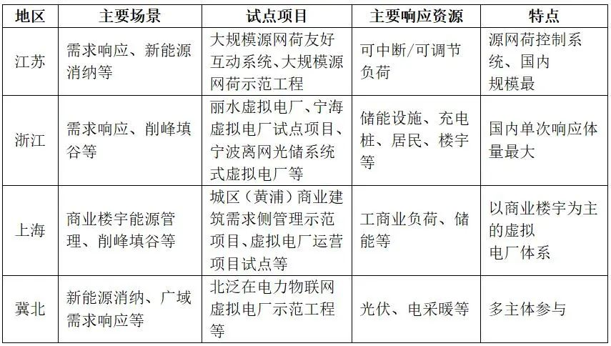 江苏、冀北、上海、浙江、天津、深圳等地结合区域特点开展了虚拟电厂的试点应用,其中江苏虚拟电厂可提供快速可中断的负荷控制服务;上海虚拟电厂建设以聚合商场、楼宇等需求响应为主,积极推进负荷集成商为主体运营的商业运营模式;冀北虚拟电厂提出了“云管边端”技术架构,并将虚拟电厂纳入电力辅助服务范围;深圳成立了国内首个城市级虚拟电厂管理中心,以负荷型、储能型资源聚合为主。