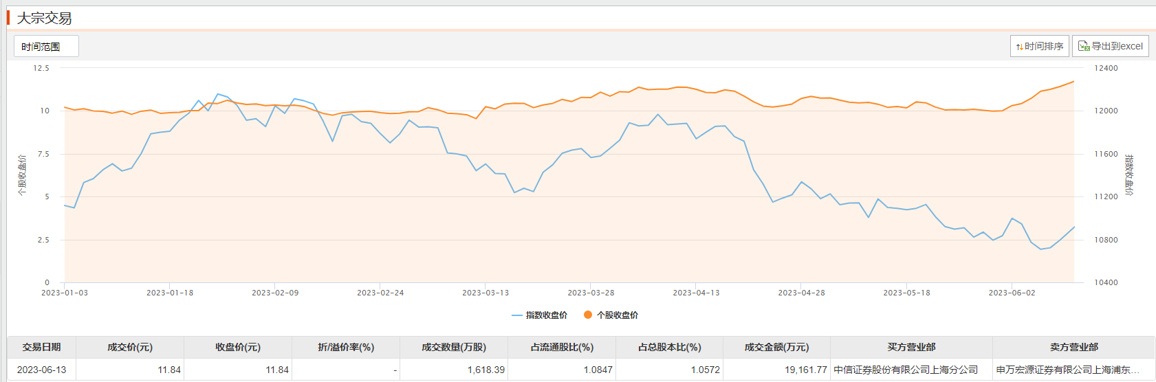 6月13日,申通快递今日大宗交易成交1618.39万股,成交额1.92亿元,占当日总成交额的48.95%,成交价11.84元,较市场收盘价持平。