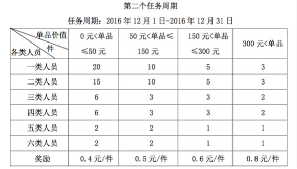 这段看上去有点“绕”的规定,从时间、任务量件数、完成比例等多个维度进行考核。如果无法达成任务目标,摆在面前的便只有处罚这一条路。处罚条件中特别强调,两个任务周期累计总任务未达到任务量件数要求,罚款300元,各类人员后3%未达到任务量件数要求的,降薪1档,促销员处罚500元。