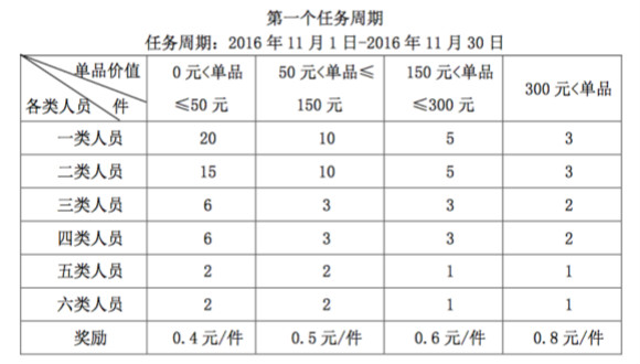 据界面新闻记者了解,图表中所列的一至六类人员主要是按职级划分的,职级越高,需要完成的单量也越高。但一位国美内部员工对此表示,即便是位于中间档的三四类人员,在一个月内也需要邀请10多人完成注册,并在不同的价位档总计完成14单交易。