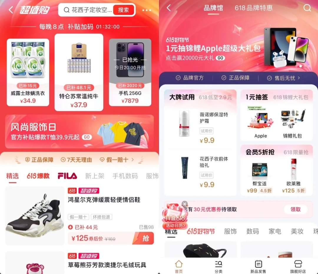和抖音同样擅长直播带货的淘宝天猫,今年把淘特的打法引入淘宝APP。低价力度和商家扶持力度方面,诚如京东所说自己的618是“全行业投入力度最大”,淘宝天猫618总负责人暮珊也直言道:“今年是历史上投入最大的一届。”
