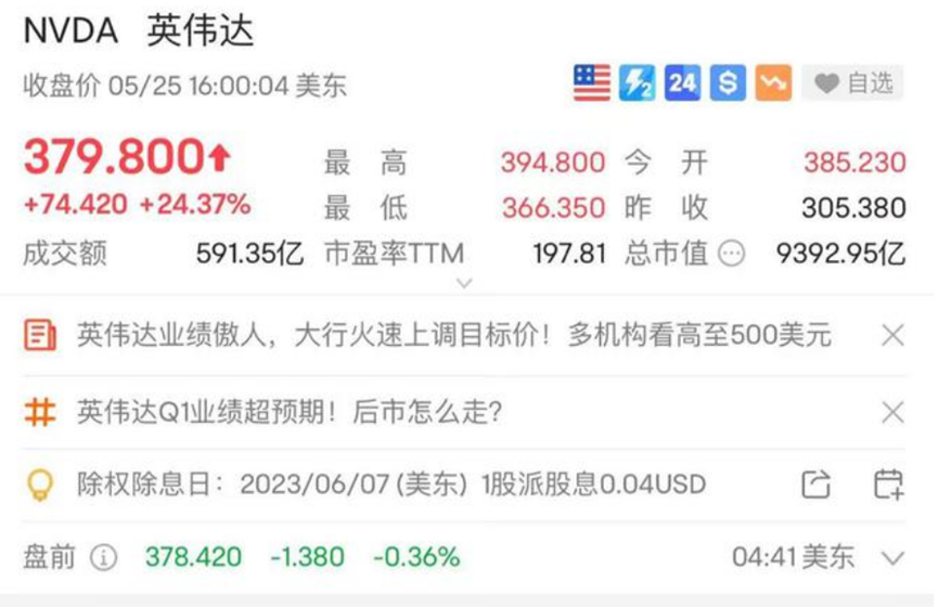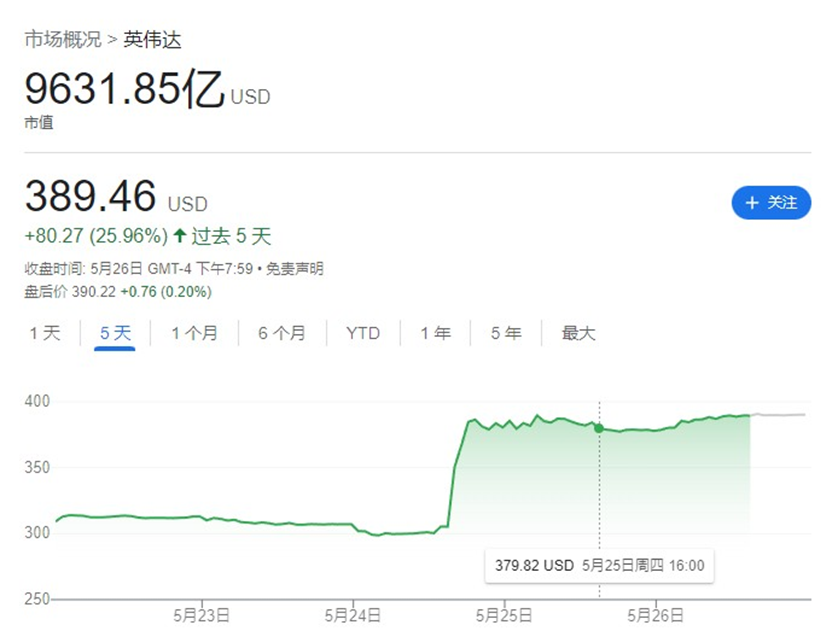 5月26日,隔夜美股,英伟达股价大涨25%,盘中一度涨超30%,市值增长了2200亿,重返万亿美元市值。